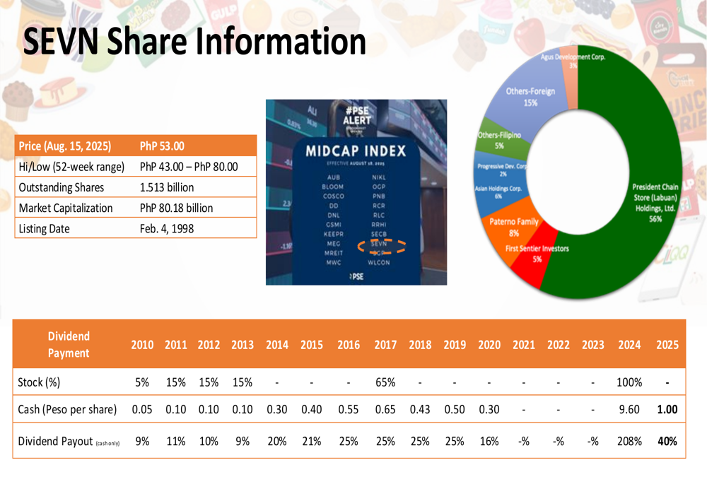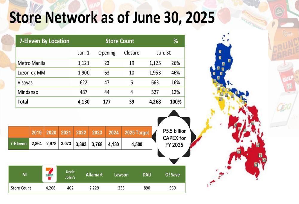 A Philippine Seven continua sua agressiva estratégia de expansão de lojas, visando 4.500 unidades até o final de 2025. Em 30 de junho de 2025, a empresa operava 4.268 lojas em todo o território filipino, distribuídas entre Metro Manila (1.125), Luzon excluindo Metro Manila (1.953), Visayas (663) e Mindanao (527).