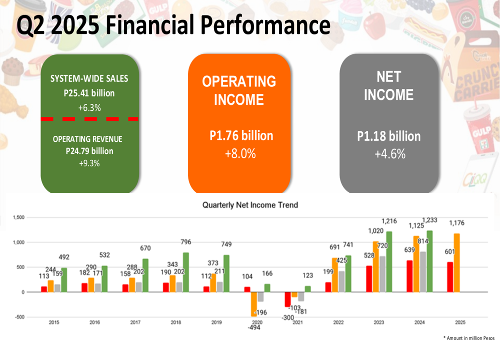 A Philippine Seven reportou um aumento de 4,6% no lucro líquido para P1,18 bilhão no 2º tri de 2025, sustentado por um crescimento mais forte de 9,3% na receita operacional para P24,79 bilhões. As vendas totais do sistema cresceram 6,3% para P25,41 bilhões, enquanto o lucro operacional aumentou 8,0% para P1,76 bilhão.