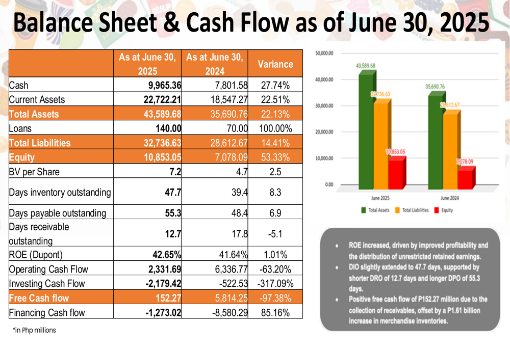 O balanço patrimonial em 30 de junho de 2025 mostrou melhoria significativa em relação ao ano anterior, com caixa aumentando 27,74% para P9.965,36 milhões e ativos totais crescendo 22,13% para P43.589,68 milhões. O patrimônio líquido aumentou substancialmente em 53,33% para P10.853,05 milhões, resultando em um retorno sobre o patrimônio líquido melhorado de 42,65%.