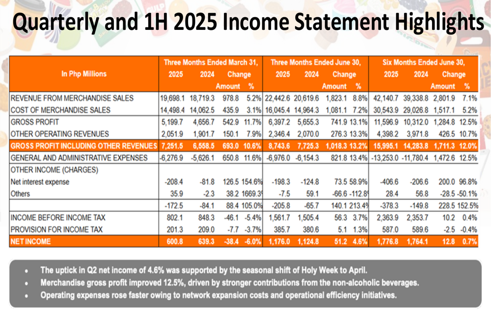 A demonstração de resultados da Philippine Seven revela que o aumento no lucro líquido do 2º tri foi sustentado pela melhoria no lucro bruto de mercadorias, embora as despesas operacionais tenham aumentado mais rapidamente devido aos custos de expansão da rede e iniciativas de eficiência operacional.