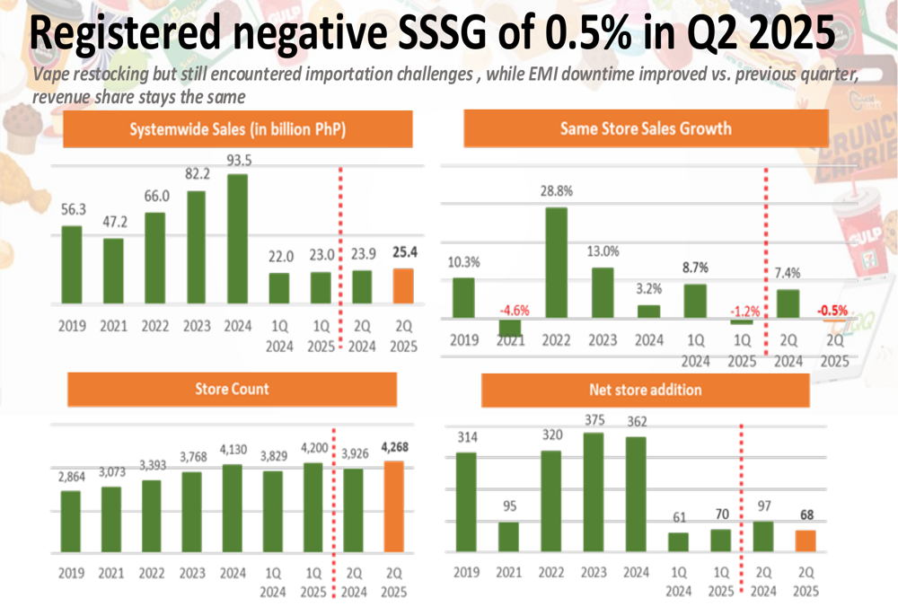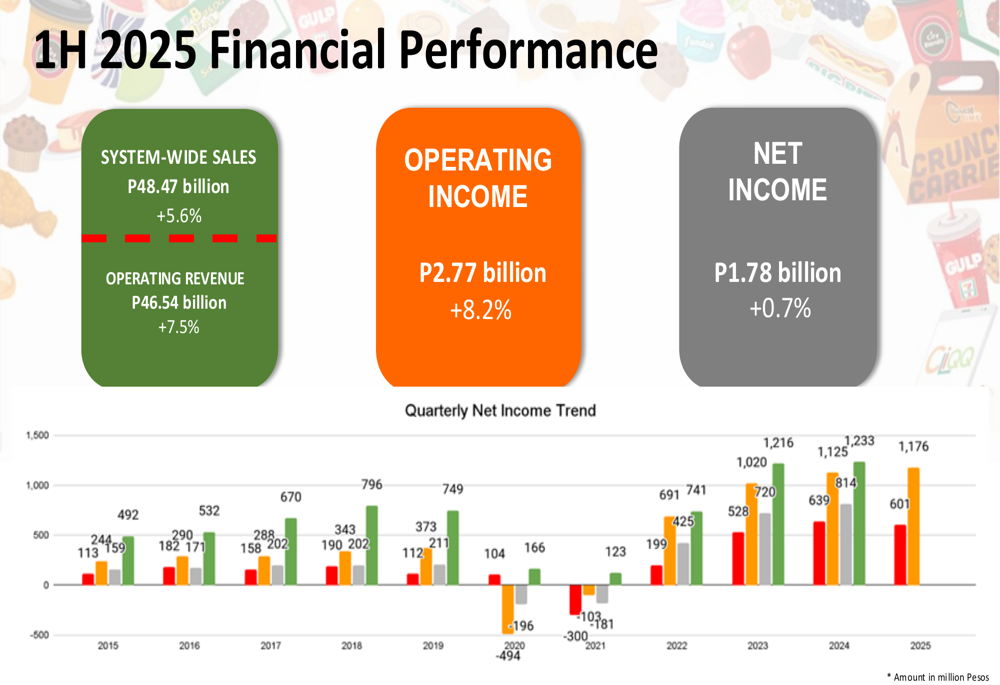 Para o primeiro semestre de 2025, o desempenho da Philippine Seven foi mais moderado, com o lucro líquido crescendo apenas 0,7% para P1,78 bilhão, apesar da receita operacional aumentar 7,5% para P46,54 bilhões e as vendas totais do sistema subirem 5,6% para P48,47 bilhões.
