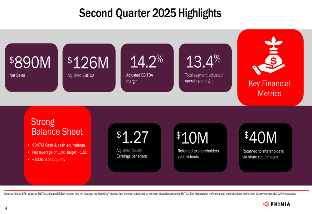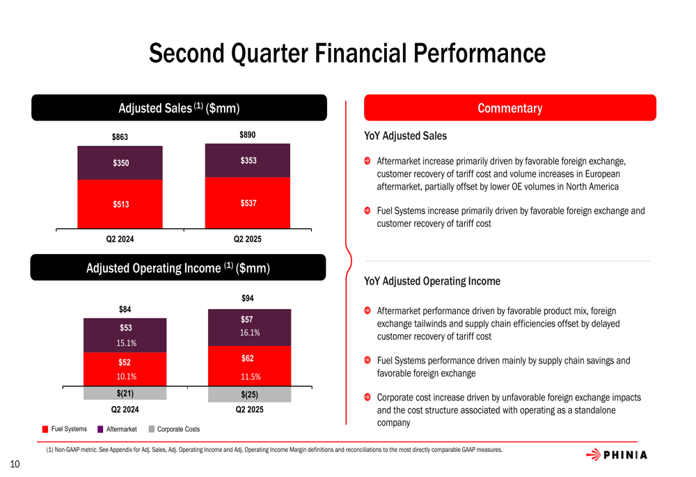 A Phinia reportou vendas líquidas de US$ 890 milhões no 2º tri de 2025, representando um aumento de 2,5% em relação aos US$ 863 milhões do ano anterior. A empresa alcançou um EBITDA ajustado de US$ 126 milhões com margem de 14,2% e margem operacional ajustada total por segmento de 13,4%. O lucro por ação diluído ajustado atingiu US$ 1,27, significativamente maior que os US$ 0,88 reportados no mesmo período do ano passado.
