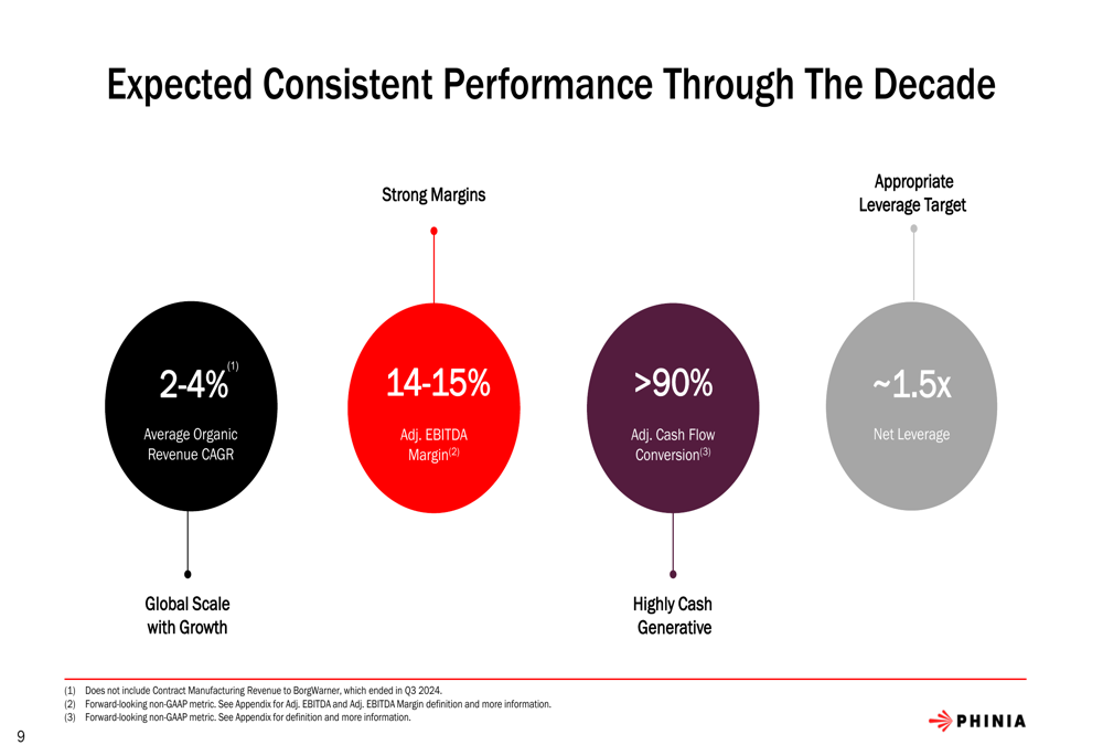 Para o longo prazo, a Phinia espera um desempenho consistente ao longo da década com um CAGR médio de receita orgânica de 2-4%, margem de EBITDA ajustada de 14-15%, conversão de fluxo de caixa ajustada superior a 90% e uma meta de alavancagem líquida de aproximadamente 1,5x.