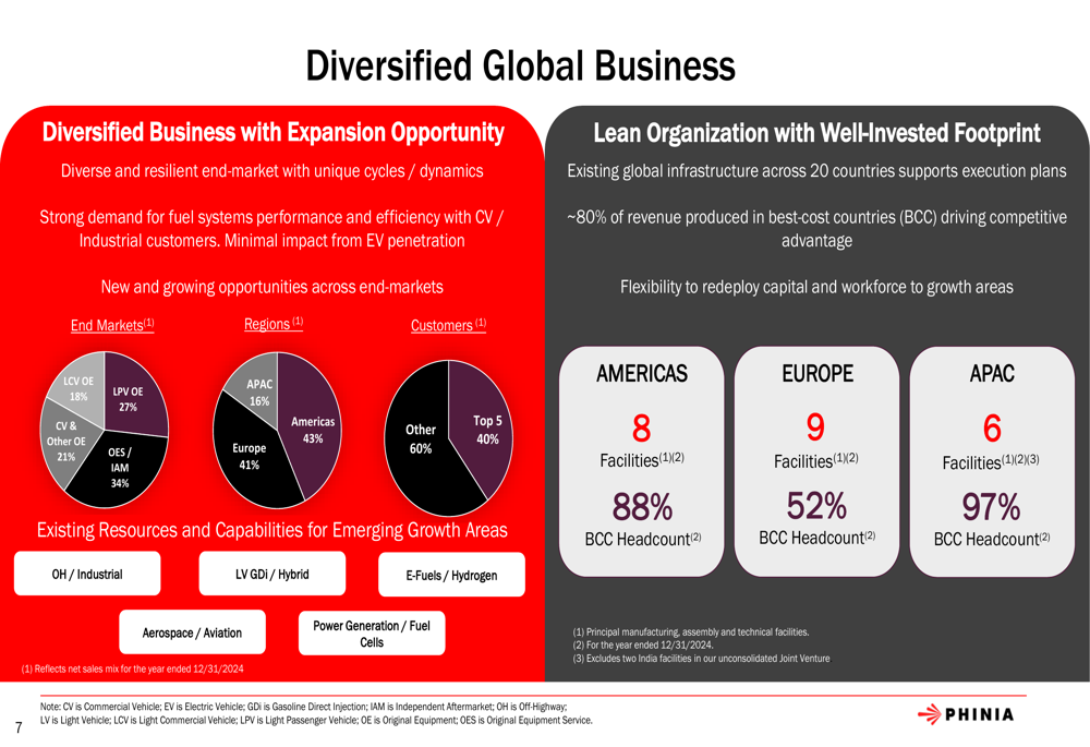 A diversificação global da empresa tem sido um fator-chave em sua resiliência. A Phinia opera em várias regiões com 23 instalações de fabricação em todo o mundo, com aproximadamente 80% da receita produzida em países de melhor custo. Essa distribuição geográfica ajuda a mitigar flutuações de mercado regionais e otimizar custos de produção.
