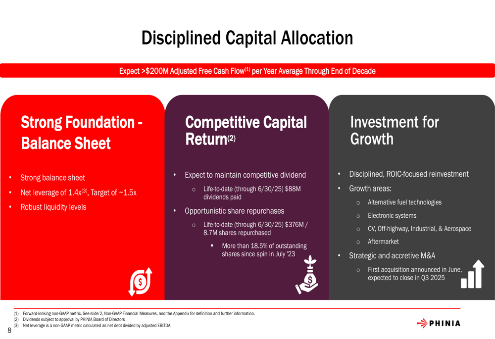 Até 30 de junho de 2025, a Phinia pagou US$ 88 milhões em dividendos e recomprou US$ 376 milhões em ações, representando aproximadamente 8,7 milhões de ações ou mais de 18,5% das ações em circulação desde o desmembramento. A empresa planeja manter um dividendo competitivo enquanto continua com recompras oportunistas de ações.