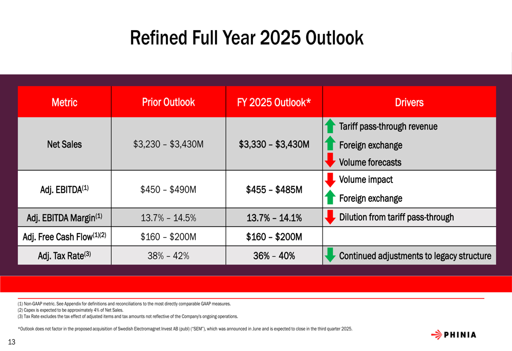 A Phinia refinou sua orientação para o ano completo de 2025, estreitando a faixa de vendas líquidas para US$ 3.330-US$ 3.430 milhões, em comparação com os US$ 3.230-US$ 3.430 milhões anteriores. A orientação do EBITDA ajustado foi ligeiramente ajustada para US$ 455-US$ 485 milhões, com uma margem esperada de 13,7-14,1%.