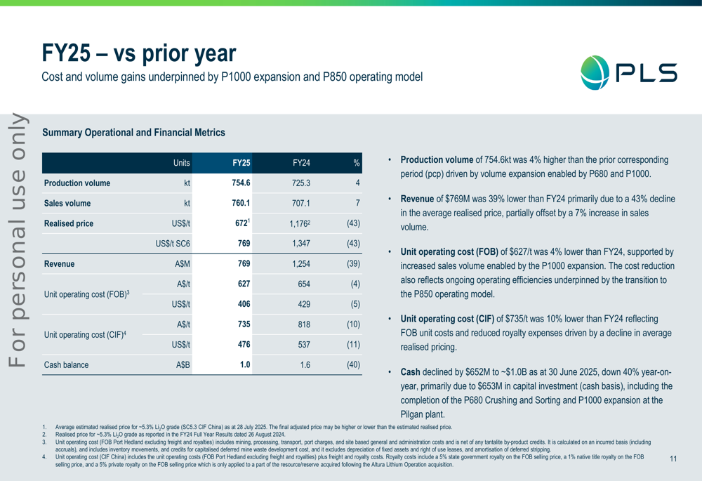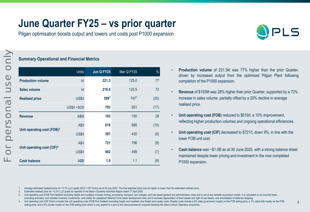 Para o ano fiscal completo de 2025, a Pilbara Minerals superou sua orientação de produção, produzindo 754,6 mil toneladas contra a previsão de 700-740 mil toneladas. Os custos operacionais unitários ficaram em A$ 627/t, dentro da faixa de orientação de A$ 620-640/t, enquanto os gastos de capital de A$ 569 milhões ficaram no limite inferior da orientação.