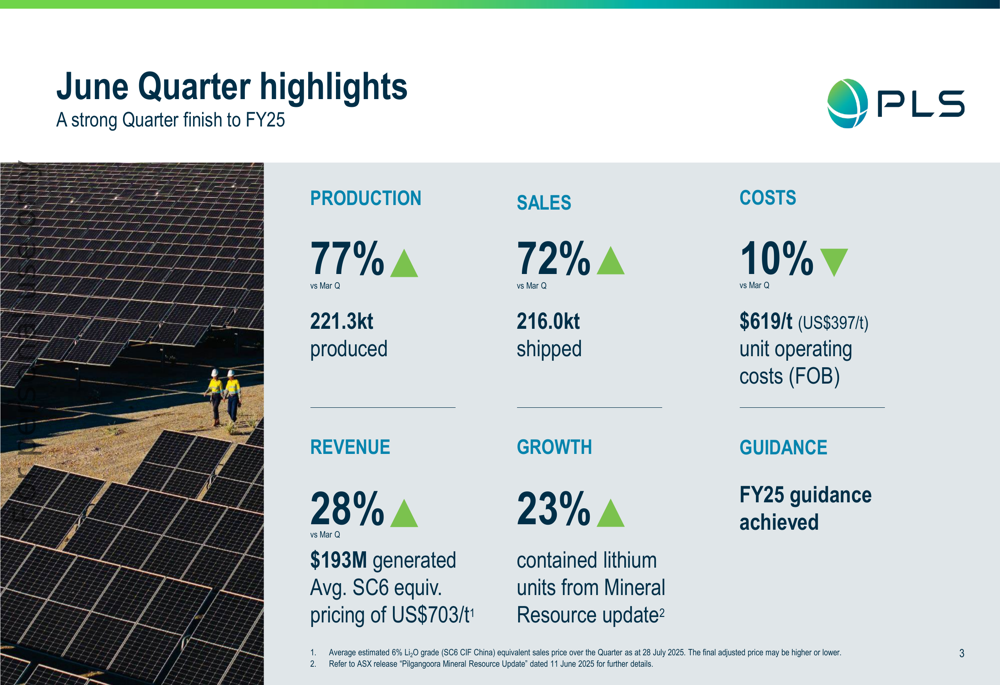 A Pilbara Minerals Ltd (ASX:PLS) encerrou o ano fiscal de 2025 com força, apresentando crescimento significativo na produção e vendas no trimestre de junho, apesar das condições desafiadoras do mercado de lítio. A apresentação de atividades do 4º trimestre da empresa, divulgada em 30 de julho de 2025, destacou conquistas operacionais e posicionamento estratégico enquanto faz a transição de expansão para otimização.