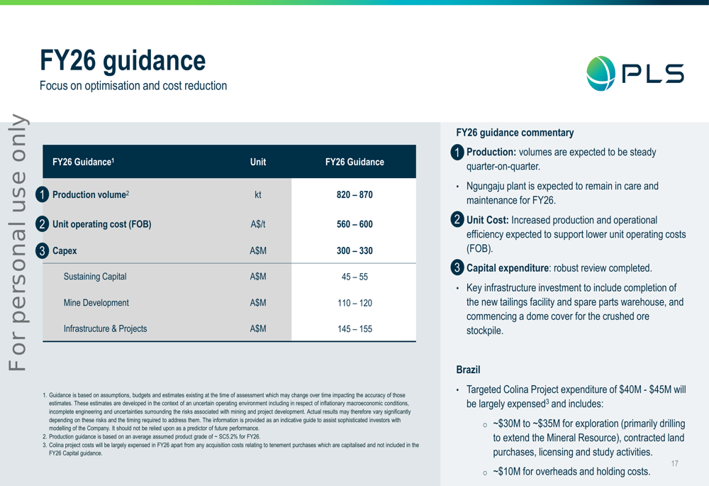A empresa delineou quatro prioridades principais para o ano fiscal de 2026: desbloquear o valor total dos recentes investimentos em Pilgangoora, focar em iniciativas de crescimento baseadas apenas em estudos sujeitas às condições de mercado, avançar na certificação do P-PLS Train 2 enquanto equilibra o aumento da produção com a preservação de caixa, e investimento moderado na exploração do Projeto Colina.