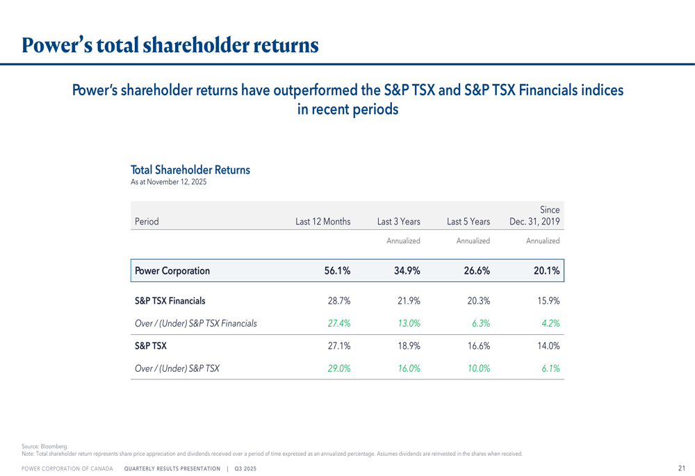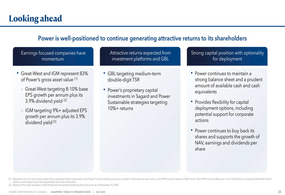 Olhando para o futuro, a Power Corporation permanece bem posicionada para crescimento contínuo, com suas empresas focadas em lucros mostrando forte impulso e retornos atrativos esperados de suas plataformas de investimento.