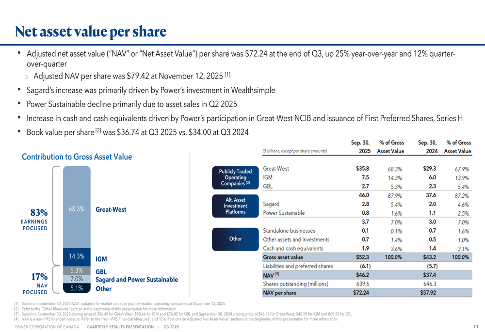 O forte desempenho da Power Corporation foi impulsionado principalmente por suas participações principais na Great-West Lifeco e IGM Financial, que juntas representam 83% do valor bruto de ativos da empresa.