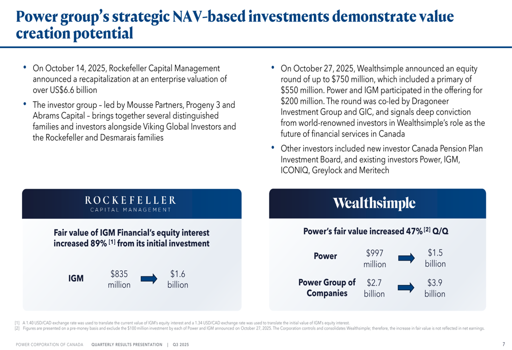 A Power Corporation destacou a significativa criação de valor de seus investimentos estratégicos, particularmente na Wealthsimple e Rockefeller Capital Management. A Wealthsimple concluiu uma rodada de captação de até US$ 750 milhões, aumentando o preço-justo da Power na empresa em 47% em relação ao trimestre anterior, chegando a US$ 1,5 bilhão. O valor total do Grupo Power of Companies na Wealthsimple agora alcança US$ 3,9 bilhões.