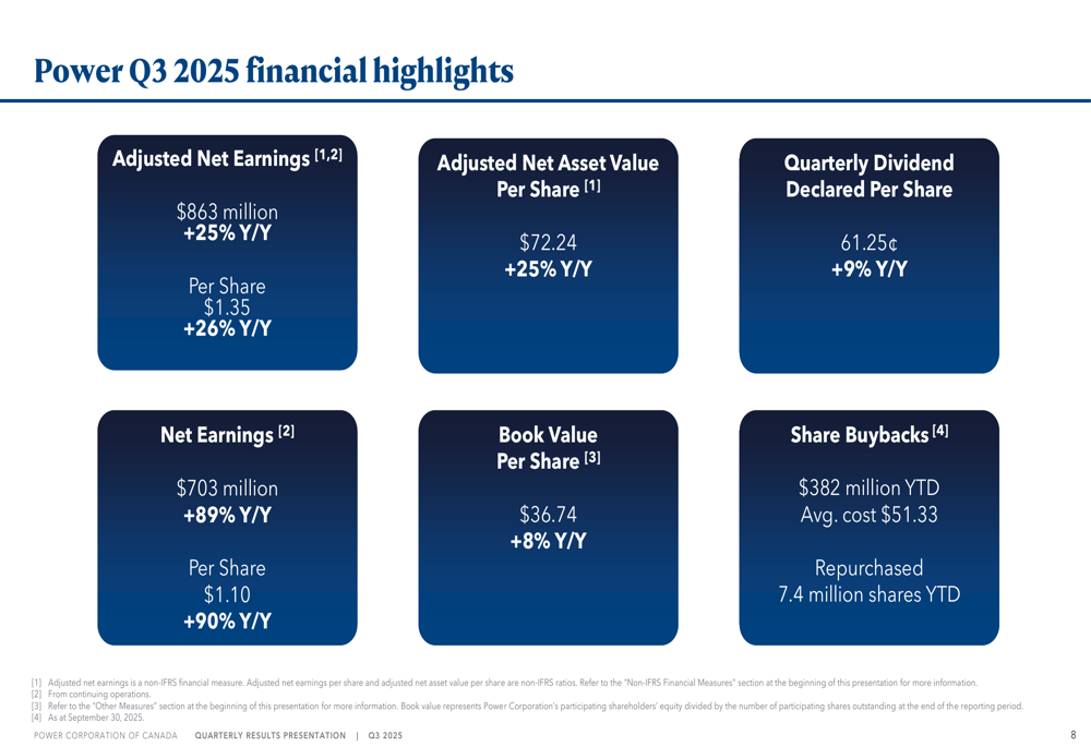 A Power Corporation reportou crescimento substancial em métricas financeiras-chave para o 3º tri de 2025, com lucro líquido ajustado atingindo US$ 863 milhões, um aumento de 25% em relação ao ano anterior. Por ação, o lucro ajustado cresceu 26% para US$ 1,35, enquanto o lucro líquido quase dobrou para US$ 703 milhões ou US$ 1,10 por ação.