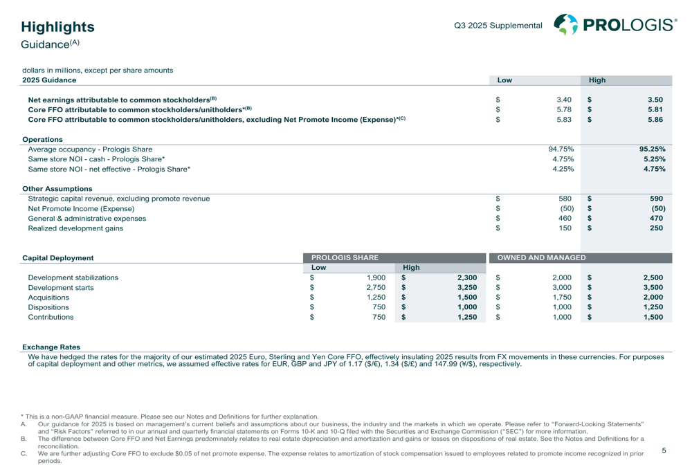 Para o ano completo de 2025, a Prologis espera lucro líquido por ação entre US$ 3,40-US$ 3,50 e FFO principal por ação de US$ 5,78-US$ 5,81. A ocupação média está projetada em 94,75%-95,25%, com crescimento do NOI de mesmas lojas de 4,75%-5,25% em base de caixa.