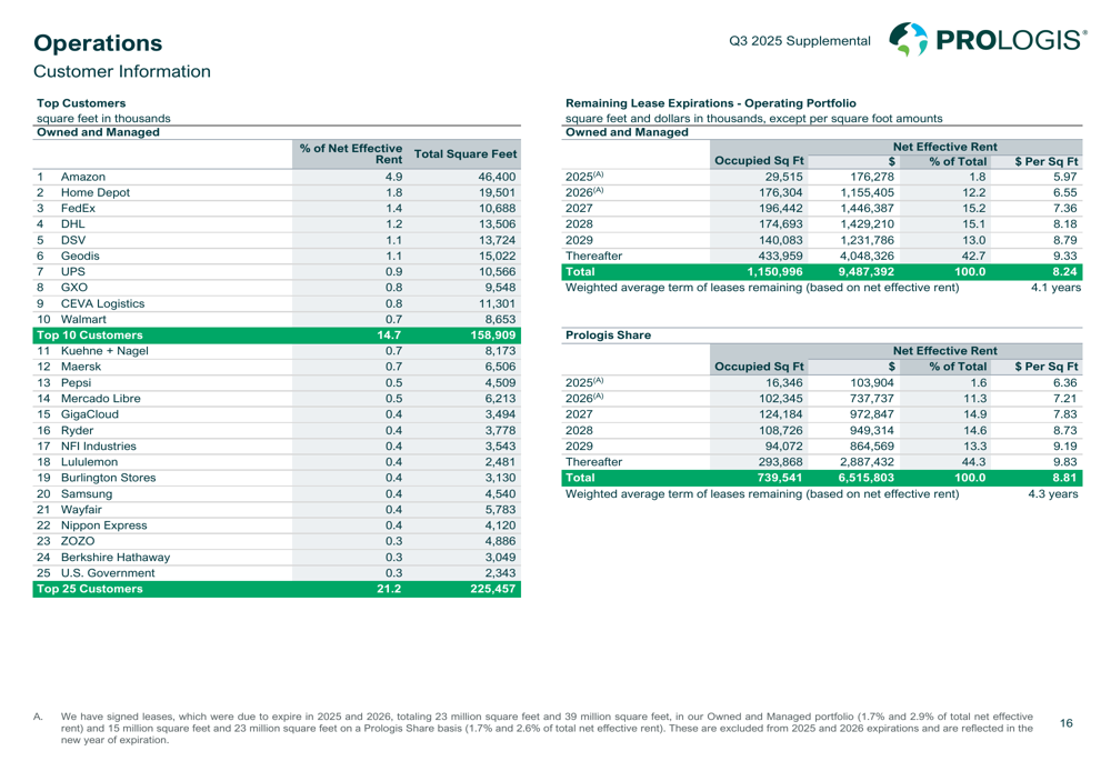 A diversificação de clientes continua sendo um ponto forte para a Prologis, com seu maior inquilino, a Amazon, representando 4,9% do aluguel efetivo líquido. Outros clientes importantes incluem Home Depot (1,8%), FedEx (1,4%), DHL (1,2%) e DSV (1,1%). Essa base diversificada de inquilinos ajuda a mitigar o risco de concentração, proporcionando uma renda de aluguel estável.