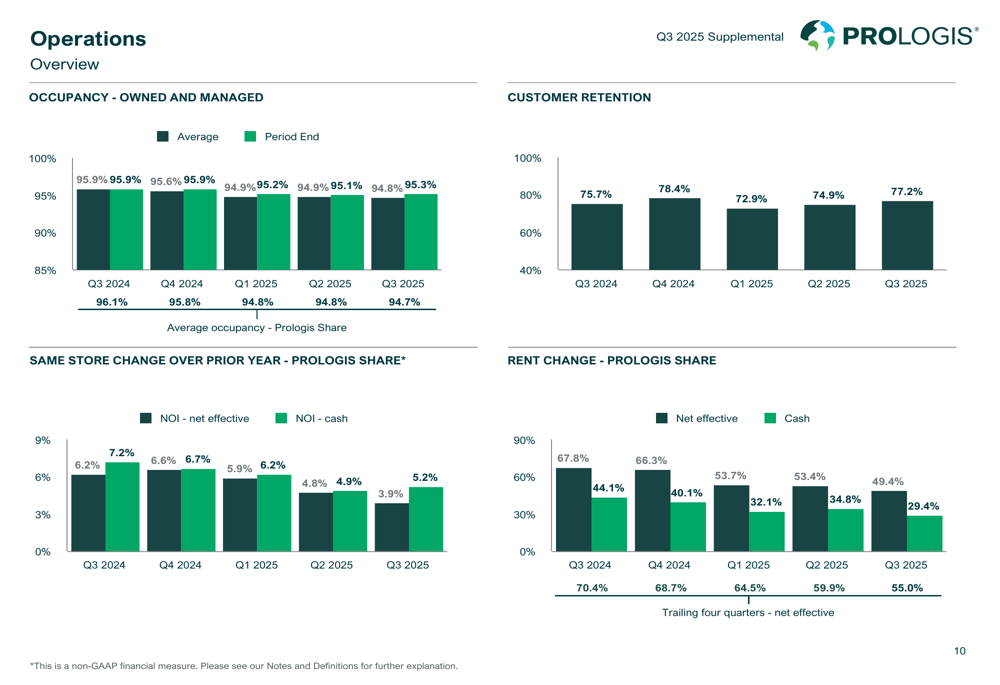 Embora a Prologis mantenha uma forte posição operacional, sua taxa de ocupação diminuiu ligeiramente para 94,7% no 3º tri de 2025, em comparação com 96,1% no 3º tri de 2024. Isso representa um pequeno declínio, mas permanece dentro da faixa prevista pela empresa. No entanto, o anúncio de resultados relatou uma ocupação do portfólio de 95,3%, um aumento de 20 pontos base, sugerindo uma possível discrepância ou metodologia de medição diferente.