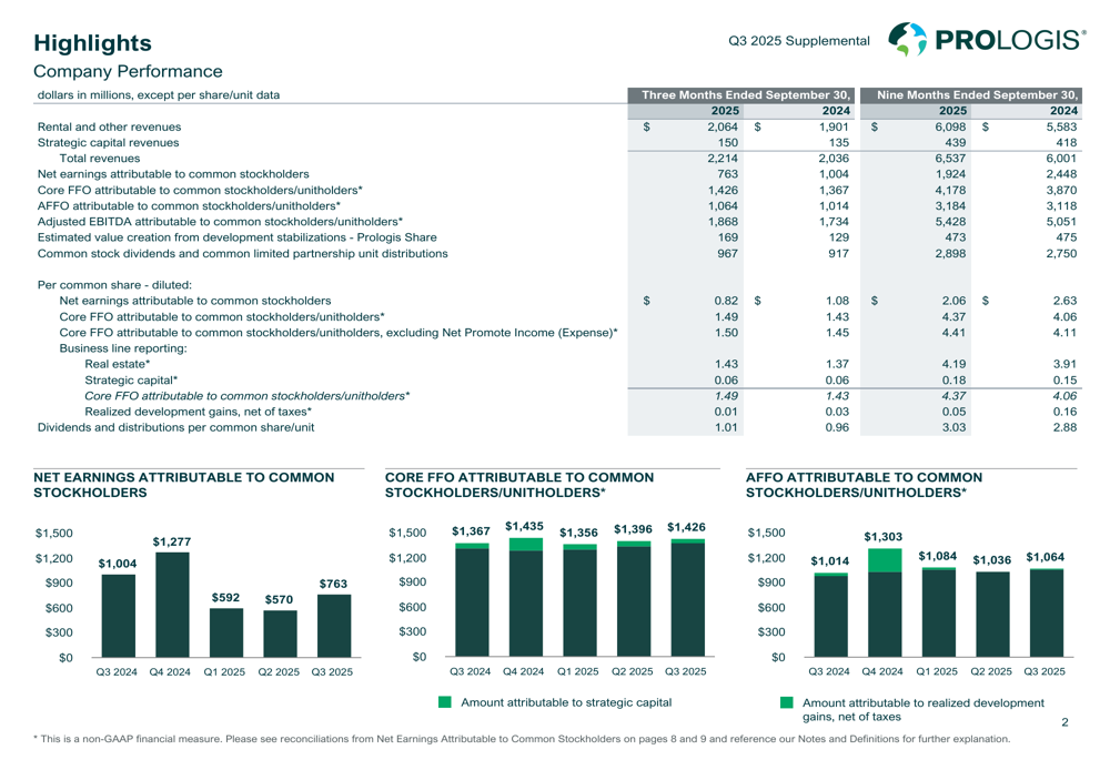 A Prologis reportou receitas totais de US$ 2,21 bilhões para o 3º tri de 2025, ligeiramente acima dos US$ 2,05 bilhões relatados no anúncio de resultados. O lucro líquido atribuível aos acionistas comuns alcançou US$ 763 milhões, com lucro por ação de US$ 0,82, superando as expectativas dos analistas de US$ 0,67 em 22,39%.
