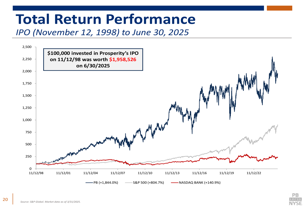O desempenho de longo prazo da empresa recompensou substancialmente os investidores. Como ilustrado no gráfico de desempenho de retorno total a seguir, US$ 100.000 investidos no IPO da Prosperity em novembro de 1998 valeriam quase US$ 2 milhões até 30 de junho de 2025: