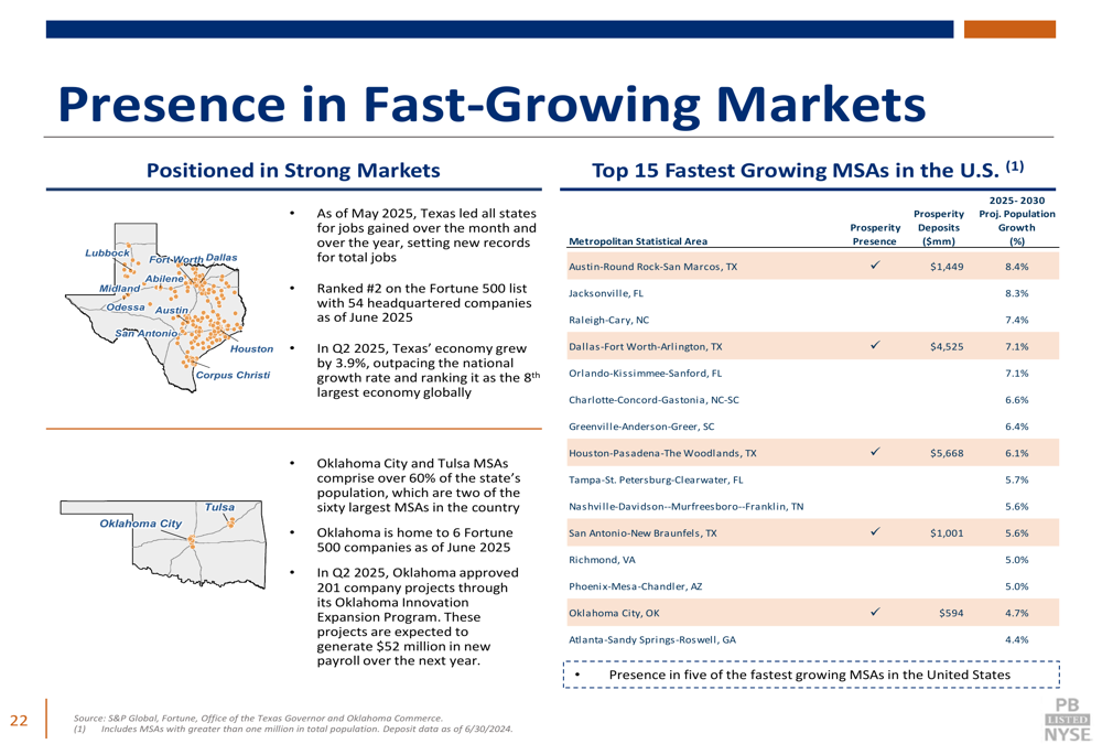A presença da Prosperity em mercados de alto crescimento proporciona uma vantagem competitiva significativa. Como mostrado no slide a seguir, destacando a presença do banco em áreas estatísticas metropolitanas (MSAs) de rápido crescimento: