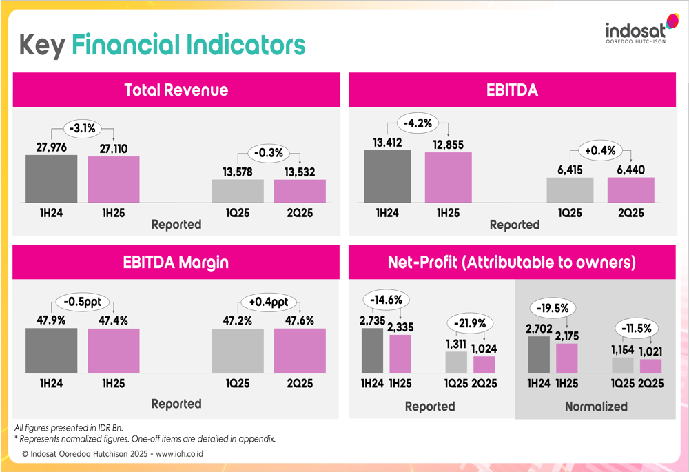 A Indosat reportou uma receita de 13.532 bilhões de IDR no 2º tri 2025, representando uma leve queda de 0,3% em comparação ao trimestre anterior, que a empresa atribuiu à "sazonalidade pós-festiva". Apesar desta queda na receita, o EBITDA aumentou 0,4% para 6.440 bilhões de IDR, com a margem EBITDA melhorando para 47,6%.