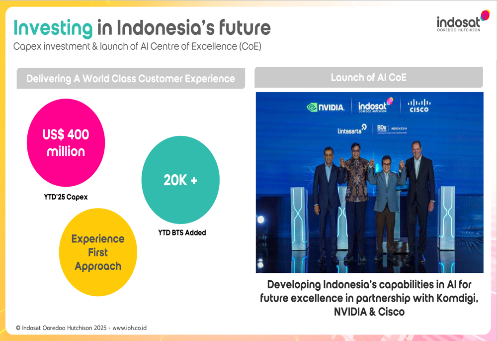A apresentação da Indosat destacou sua transformação em uma "Techco impulsionada por IA" como foco estratégico central. A empresa investiu US$ 400 milhões em despesas de capital no acumulado do ano, adicionando mais de 20.000 estações transceptoras base (BTS) para melhorar a cobertura e qualidade da rede.