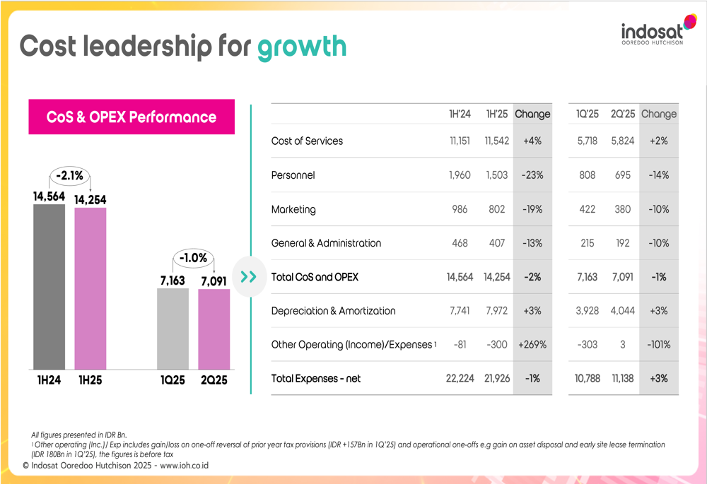 Os esforços de otimização de custos da Indosat compensaram parcialmente a queda na receita, com o total de Custo de Serviços (CoS) e Despesas Operacionais (OPEX) diminuindo 2,1% em comparação anual no 1º semestre de 2025. Particularmente notáveis foram as reduções nos custos de pessoal (-23%), despesas de marketing (-19%) e despesas gerais e administrativas (-13%).