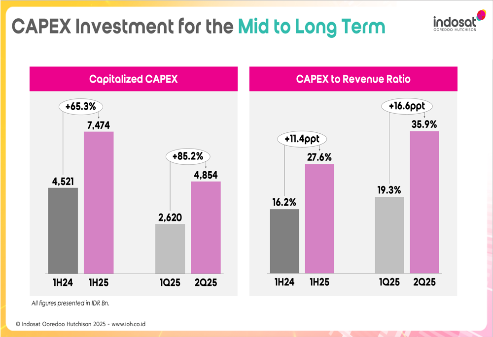 Apesar dos desafios de receita, a Indosat aumentou significativamente seus investimentos em capital, com o CAPEX do 1º semestre de 2025 atingindo 7.474 bilhões de IDR, um aumento de 65,3% em comparação anual. Isso elevou a relação CAPEX/receita para 27,6%, um aumento de 11,4 pontos percentuais em relação ao 1º semestre de 2024. O segundo trimestre viu um aumento ainda mais dramático nos investimentos, com o CAPEX do 2º tri subindo 85,2% em relação ao 1º tri.