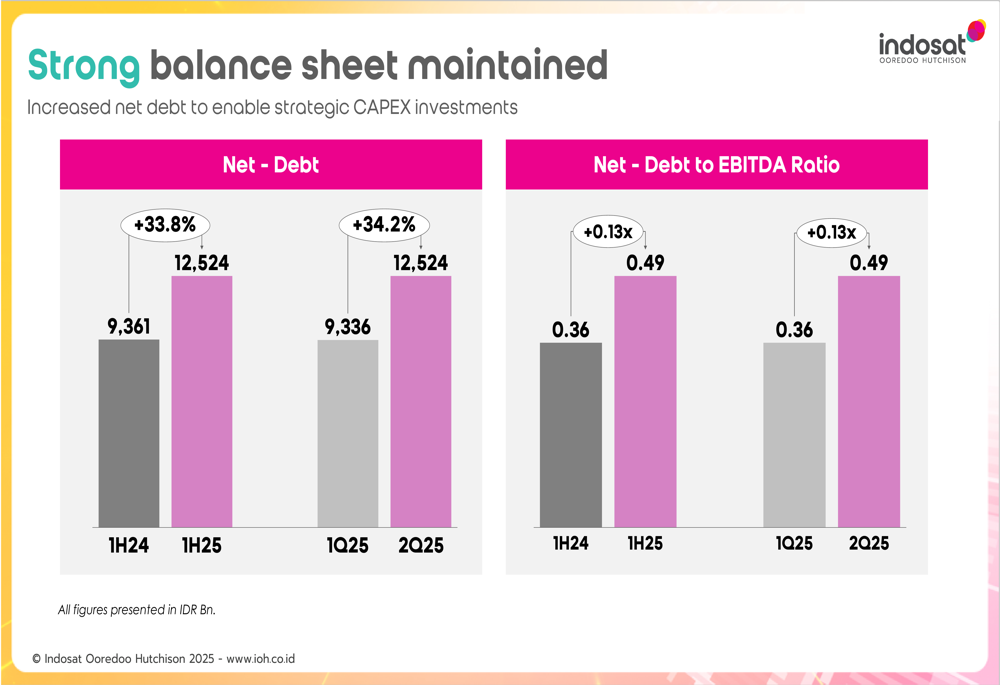 O aumento das despesas de capital impactou a posição de dívida da Indosat, com a dívida líquida aumentando 33,8% em comparação anual para 12.524 bilhões de IDR. No entanto, a empresa mantém que seu balanço permanece forte, com uma relação dívida líquida/EBITDA de 0,49x, ainda bem abaixo dos níveis de alerta do setor.