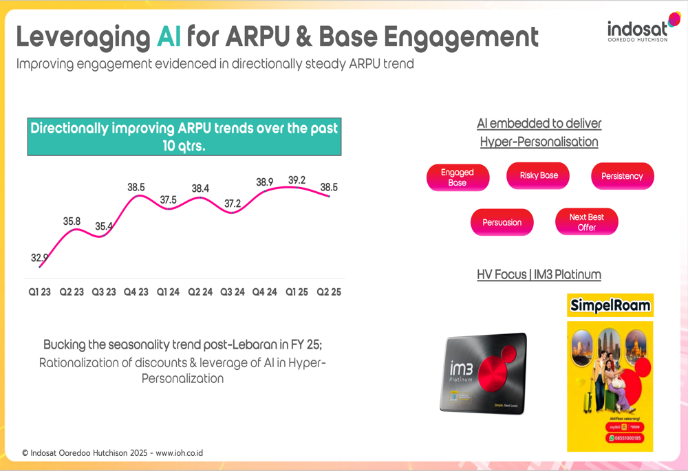 A empresa manteve sua base de clientes em 95,4 milhões de assinantes, enquanto aumentou seu engajamento digital, com usuários ativos mensais do aplicativo crescendo em 1,7 milhão para 47,4 milhões. A Receita Média por Usuário (ARPU) diminuiu ligeiramente em 1,8% para 38.500 IDR, embora a empresa tenha enfatizado que esta se manteve "firme" considerando os fatores sazonais.