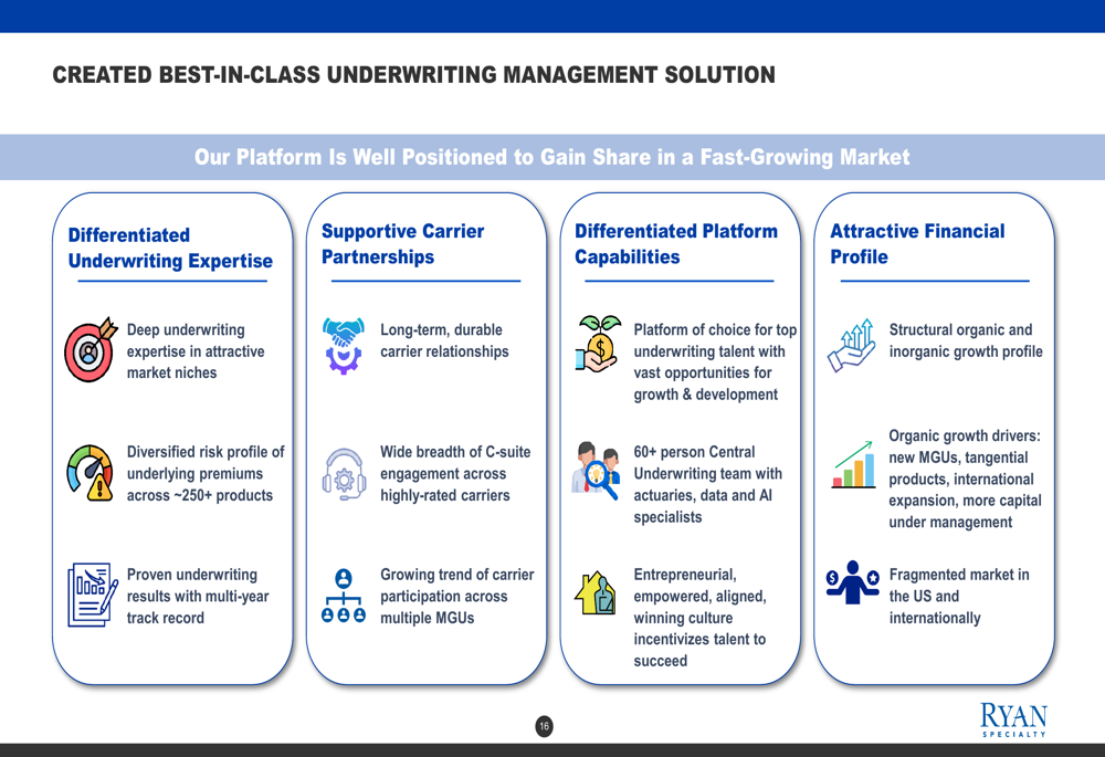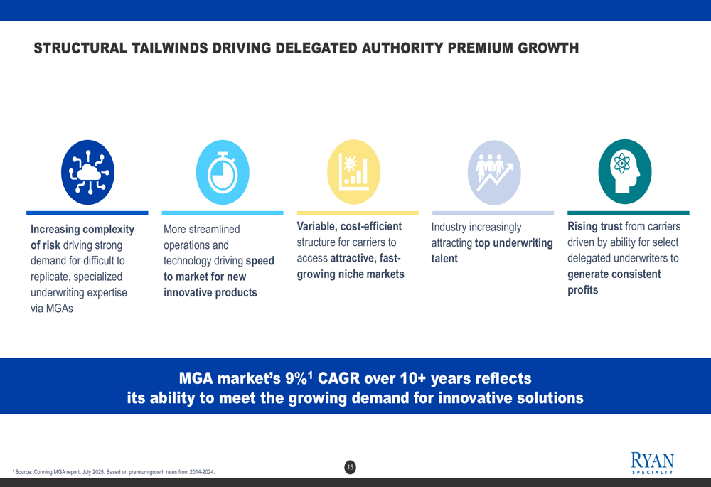 O crescimento da empresa é apoiado por ventos estruturais favoráveis no mercado de autoridade delegada, que experimentou uma CAGR de 9% por mais de 10 anos. Esses ventos favoráveis incluem aumento da complexidade de riscos, operações e tecnologia simplificadas, estruturas de custo eficientes para seguradoras, talentos de subscrição de alto nível e confiança crescente das seguradoras.