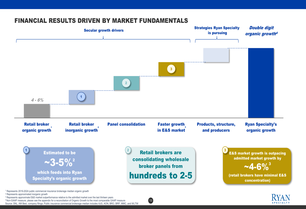 Os resultados financeiros da Ryan Specialty são impulsionados por fortes fundamentos de mercado, incluindo o crescimento do mercado E&S superando o mercado tradicional em aproximadamente 4-6% e a consolidação de painéis de corretores atacadistas de centenas para apenas 2-5 parceiros preferenciais: