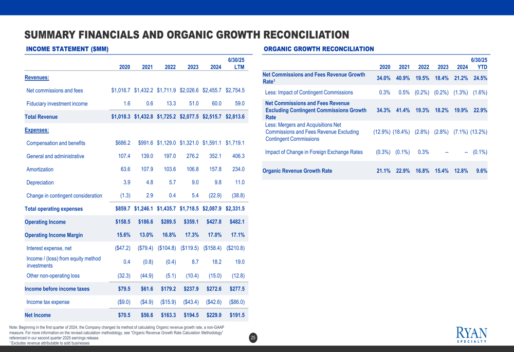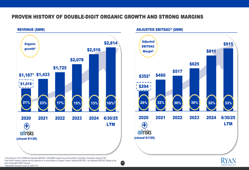 A Ryan Specialty Group Holdings Inc (Nova York:RYAN), a segunda maior corretora atacadista e subscritora de seguros patrimoniais e de acidentes dos EUA, demonstrou seu contínuo desempenho forte e posicionamento estratégico em sua apresentação aos investidores em julho de 2025. A empresa reportou receita total de US$ 2,8 bilhões para os doze meses encerrados em 30 de junho de 2025, com crescimento da receita total acumulada no ano de 23,9% e crescimento orgânico de 9,6%, mantendo seu impressionante histórico de crescimento orgânico de dois dígitos desde sua fundação em 2010.