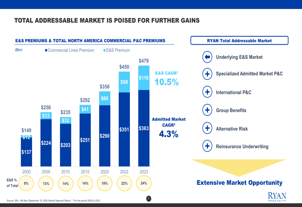 A Ryan Specialty se posicionou estrategicamente no atrativo mercado E&S, que representa 24% do mercado de seguros comerciais e cresceu a uma CAGR de 10,5% de 2000-2023, superando significativamente a CAGR de 4,3% do mercado tradicional. A empresa coloca 78% de seus prêmios no mercado E&S, capitalizando neste segmento de crescimento mais rápido.