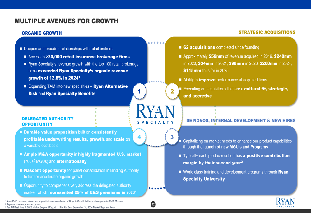 A Ryan Specialty delineou múltiplos caminhos para crescimento contínuo, incluindo expansão orgânica, aquisições estratégicas, oportunidades de autoridade delegada e iniciativas de novo. A empresa completou 62 aquisições até o momento, com adições significativas de receita a cada ano: US$ 240 milhões em 2020, US$ 34 milhões em 2021, US$ 98 milhões em 2023, US$ 268 milhões em 2024, e US$ 115 milhões até agora em 2025.