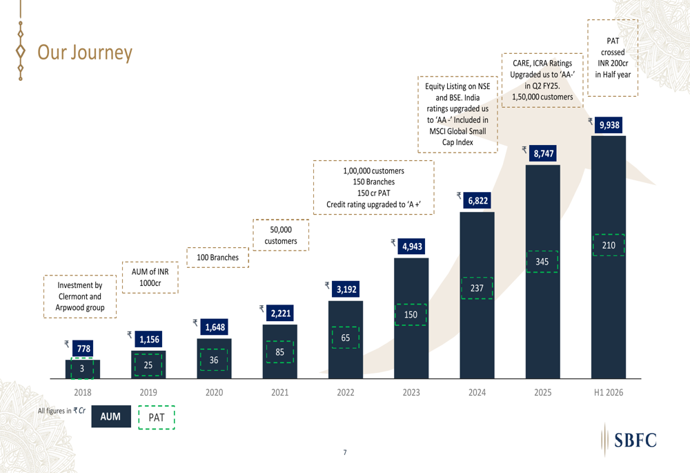 A empresa alcançou vários marcos notáveis ao longo de sua jornada, incluindo a listagem de ações na NSE e BSE em 2024, inclusão no Índice MSCI Global Small Cap e upgrades de classificação de crédito para ’AA-’ pela CARE e ICRA no 2º tri do ano fiscal 2025. A SBFC também expandiu significativamente sua rede de agências, adicionando 28 filiais no último ano para atingir um total de 220.