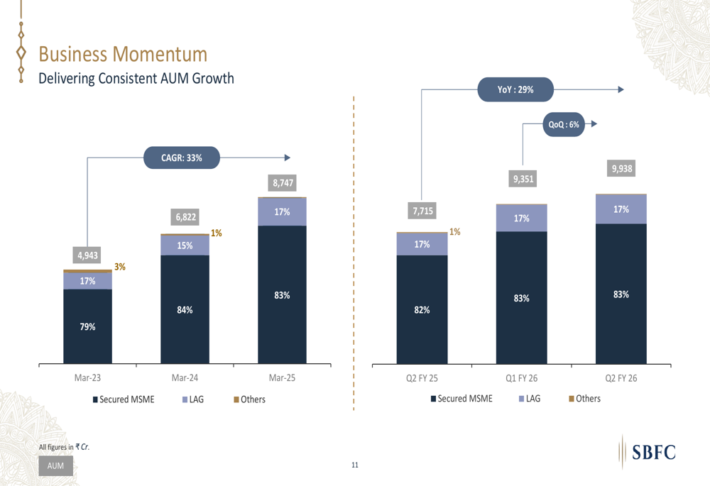 A SBFC Finance mantém uma abordagem focada com sua carteira predominantemente composta por empréstimos garantidos para MPMEs, que representam 83% do AUM total no 2º tri do ano fiscal 2026. Os 17% restantes são compostos por Empréstimos Contra Ouro (LAG), com exposição insignificante a outros segmentos.