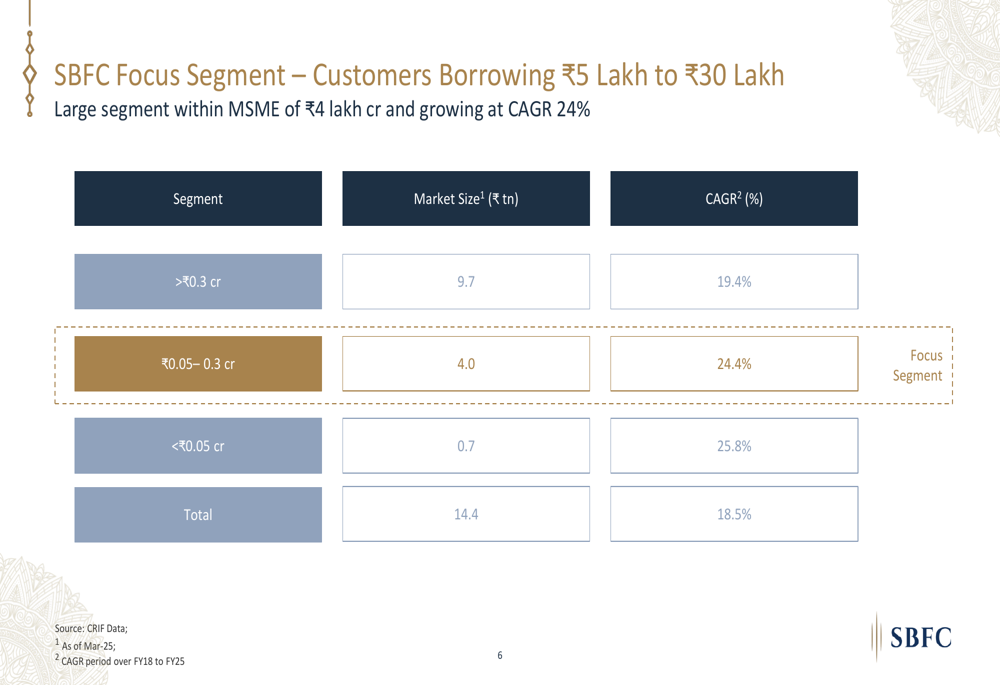 A SBFC Finance estabeleceu-se como uma financiadora focada no segmento de MPMEs com garantias, fornecendo empréstimos principalmente para pequenas empresas. O mercado-alvo da empresa mostra potencial significativo de crescimento, com o segmento de valores entre R$ 5 lakh e R$ 30 lakh crescendo a uma taxa composta anual de 24,4%.