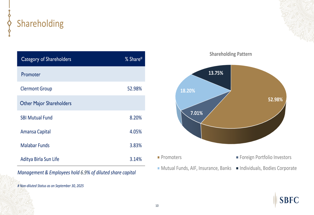 A SBFC Finance beneficia-se de uma estrutura acionária estável, com os promotores detendo 52,98% da empresa. Investidores institucionais, incluindo fundos mútuos, fundos de investimento alternativos, companhias de seguros e bancos, coletivamente detêm 18,20%, enquanto investidores estrangeiros de portfólio representam 13,75%.
