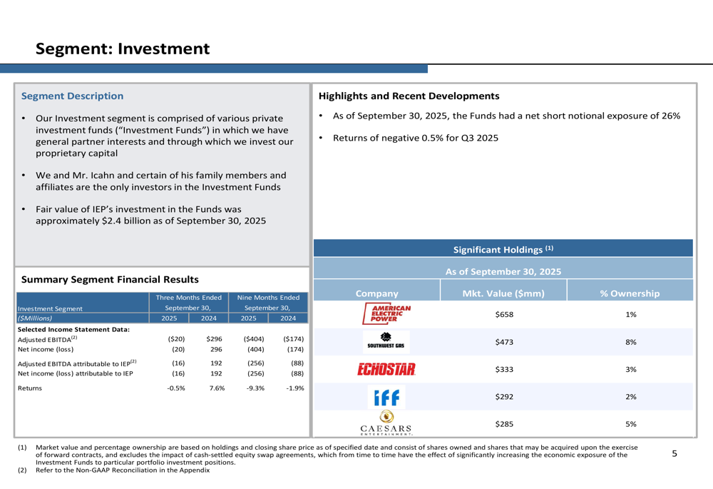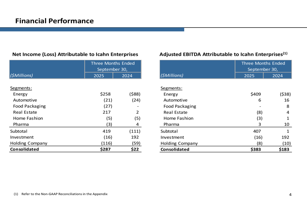A Icahn Enterprises reportou um lucro líquido atribuível à IEP de US$ 287 milhões (US$ 0,49 por unidade depositária) para o 3º tri 2025, comparado a apenas US$ 22 milhões (US$ 0,05 por unidade) no 3º tri 2024. Este aumento substancial está alinhado com a surpresa de lucros reportada pela empresa de 188,24% acima das expectativas dos analistas.