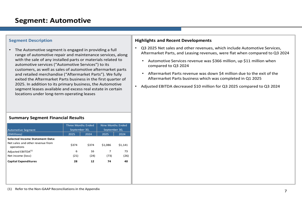 O segmento Automotivo, que fornece serviços de reparo e manutenção, reportou vendas líquidas estáveis ano a ano em US$ 374 milhões. Enquanto a receita de Serviços Automotivos aumentou em US$ 11 milhões, isso foi compensado por um declínio de US$ 4 milhões na receita de Peças de Reposição após a completa saída da empresa desse negócio no 1º tri 2025.