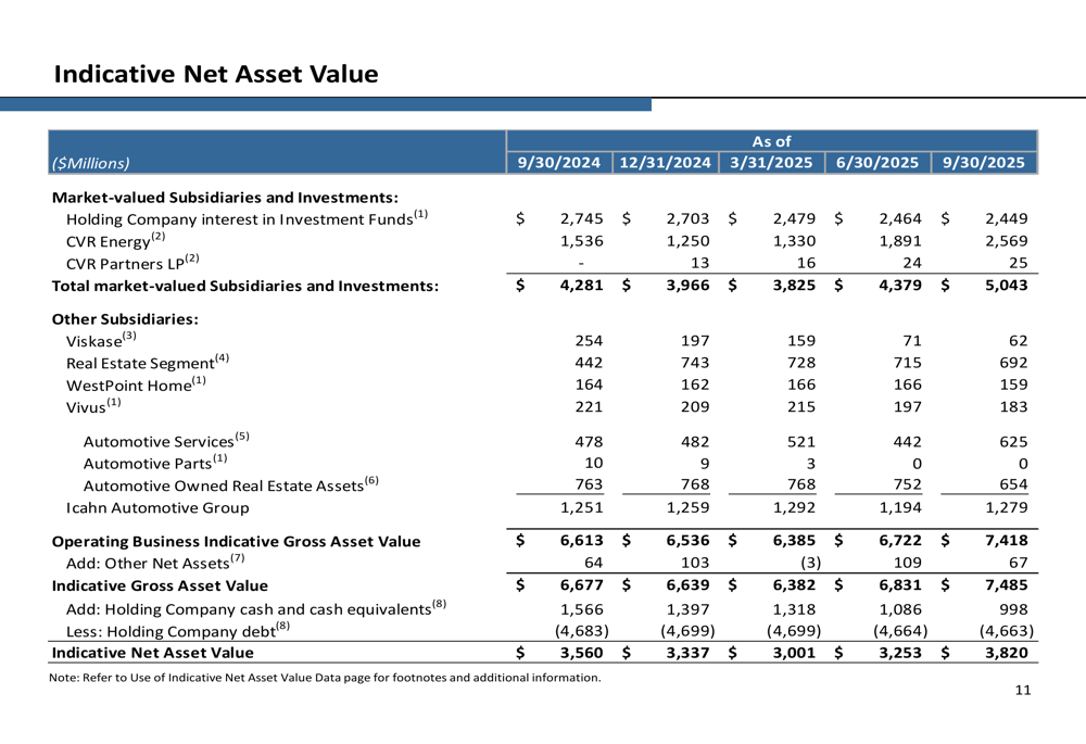 A Icahn Enterprises manteve uma forte posição de liquidez em 30 de setembro de 2025, com liquidez total de US$ 4,59 bilhões. Isso inclui US$ 3,43 bilhões em Ativos Líquidos da Holding e US$ 1,16 bilhão em Liquidez das Subsidiárias.