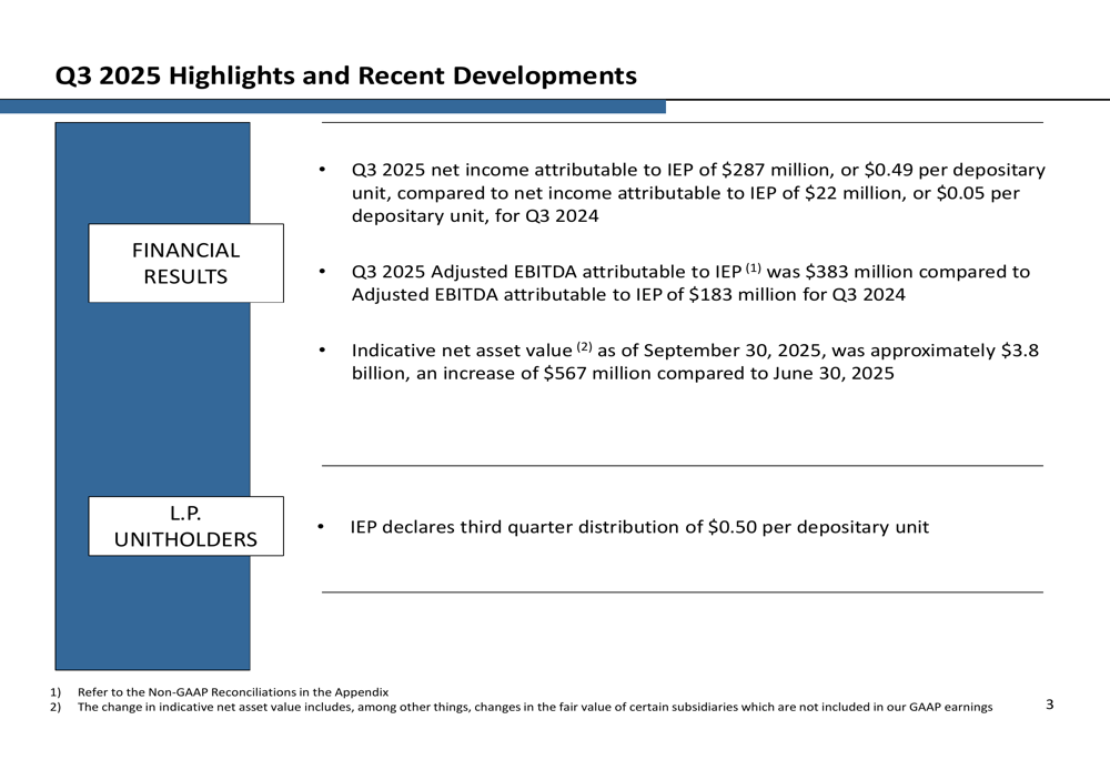 O EBITDA ajustado atribuível à IEP mais que dobrou para US$ 383 milhões, comparado aos US$ 183 milhões no mesmo período do ano anterior. O valor líquido indicativo dos ativos da empresa alcançou aproximadamente US$ 3,8 bilhões em 30 de setembro de 2025, representando um aumento de US$ 567 milhões em relação ao trimestre anterior.