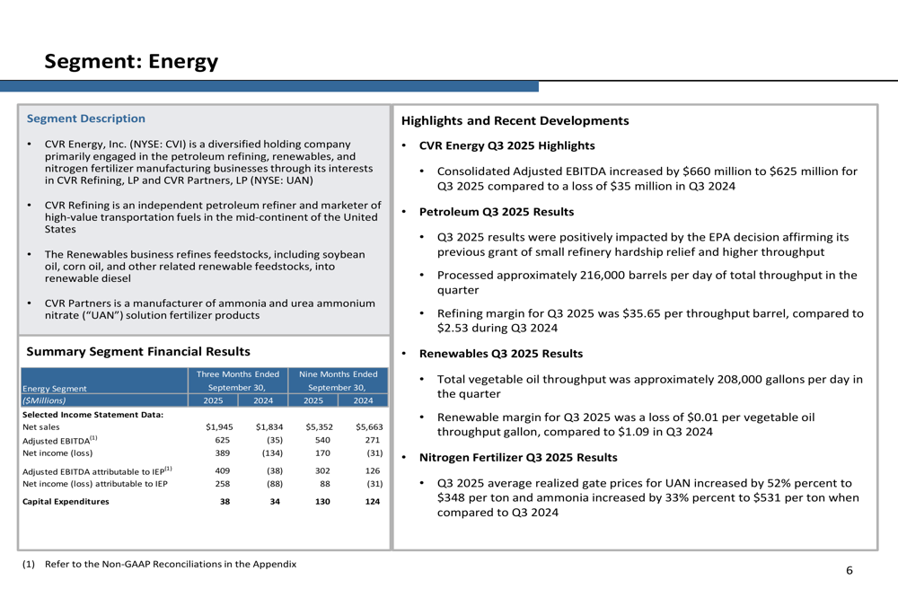O segmento de Energia, operado através da CVR Energy, Inc. (Nova York:CVI), foi o destaque do trimestre. O EBITDA ajustado do segmento aumentou dramaticamente para US$ 409 milhões no 3º tri 2025, comparado a um valor negativo de US$ 38 milhões no mesmo período do ano anterior.