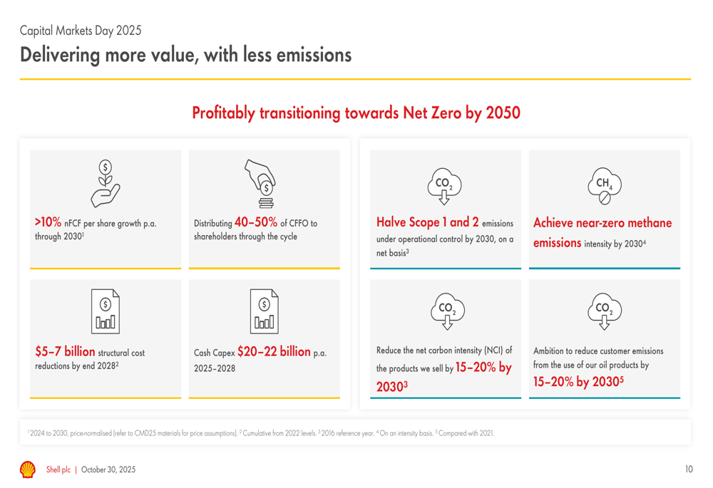 Na frente ambiental, a Shell se comprometeu a reduzir pela metade as emissões de Escopo 1 e 2 sob controle operacional até 2030, alcançar intensidade de emissões de metano próxima a zero e reduzir a intensidade líquida de carbono dos produtos vendidos em 15-20% até 2030.