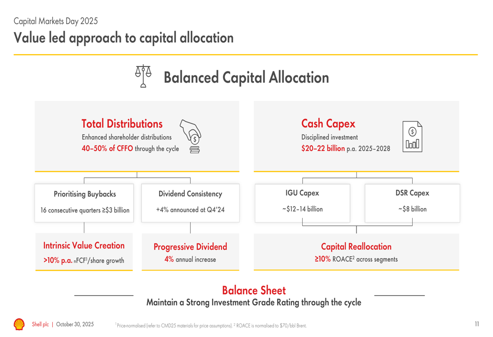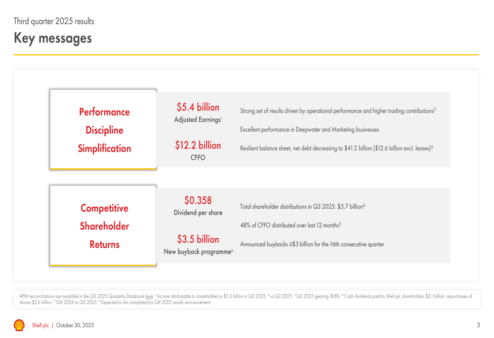 A Shell reafirmou seu compromisso com o retorno aos acionistas, anunciando um dividendo de US$ 0,358 por ação para o 3º tri de 2025 e distribuições totais aos acionistas de US$ 5,7 bilhões para o trimestre. A empresa distribuiu 48% de seu fluxo de caixa operacional aos acionistas nos últimos 12 meses, em linha com sua meta de 40-50%.