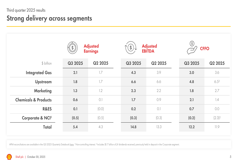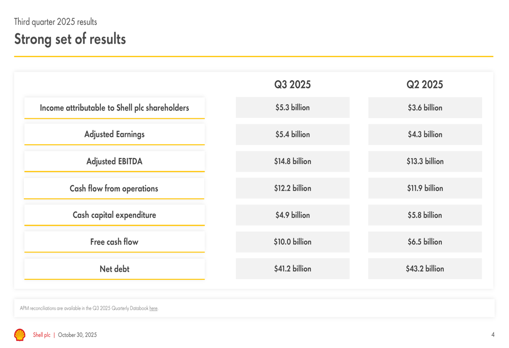 Os resultados do terceiro trimestre da Shell mostraram uma ampla melhoria nos principais indicadores financeiros em comparação com o segundo trimestre de 2025, impulsionados pelo que a empresa descreveu como "forte desempenho operacional e maiores contribuições de trading".