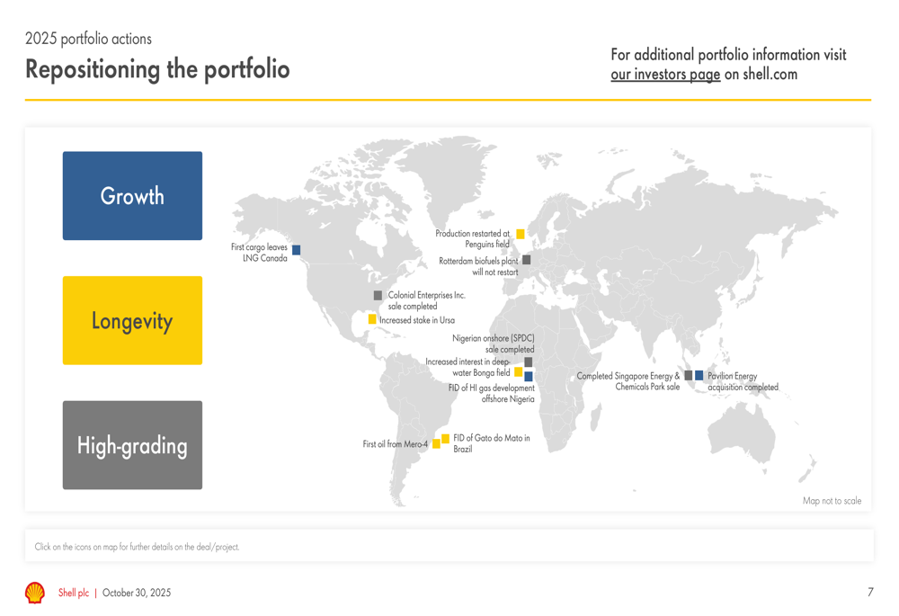 A Shell delineou várias ações estratégicas de portfólio realizadas durante 2025, categorizadas como iniciativas de crescimento, projetos de longevidade e aprimoramento de portfólio. Essas ações abrangem múltiplas geografias e segmentos de negócios, refletindo a presença global e a abordagem diversificada da empresa.