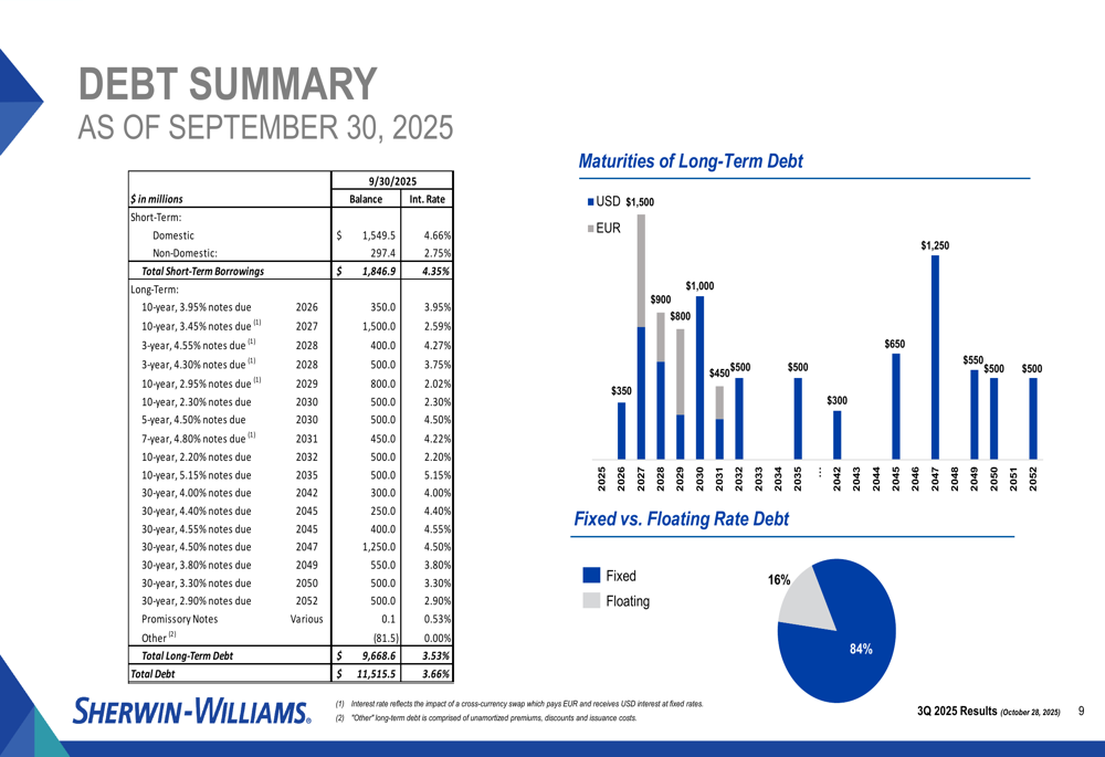 O perfil de vencimento da dívida da empresa está bem estruturado, com vencimentos limitados no curto prazo. Em 30 de setembro de 2025, a Sherwin-Williams tinha US$ 241,5 milhões em caixa e US$ 3,13 bilhões em crédito disponível, proporcionando ampla liquidez. O índice de alavancagem da empresa (Dívida líquida/EBITDA Ajustado TTM) estava em um confortável 2,5x.