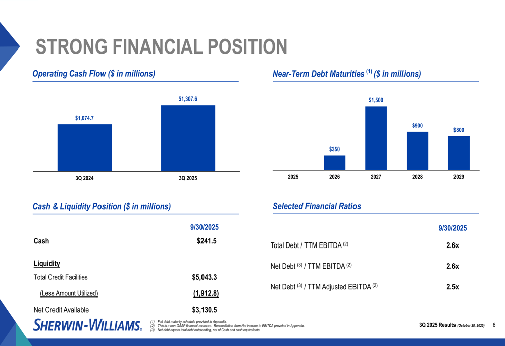 A Sherwin-Williams manteve uma forte posição financeira no 3º tri de 2025, com geração substancial de fluxo de caixa e um perfil de dívida gerenciável: