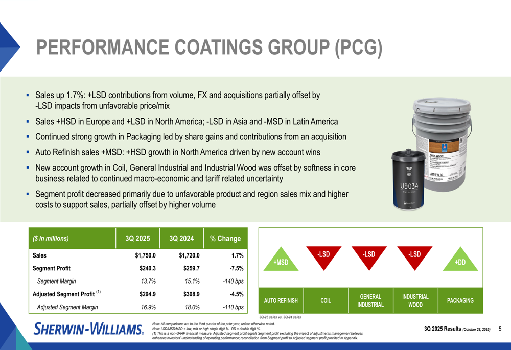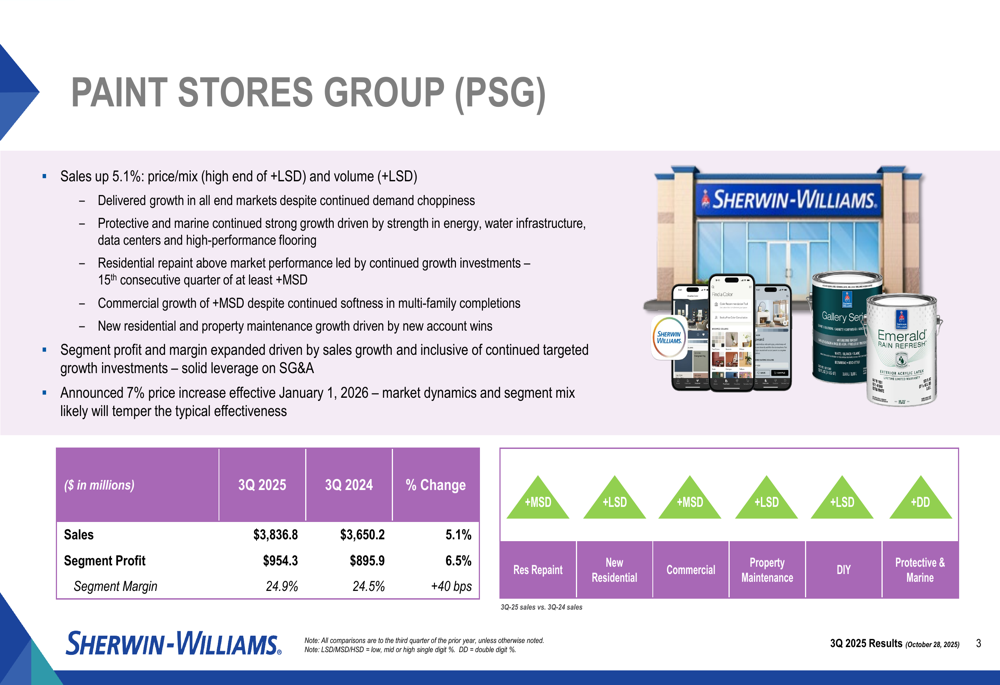 As vendas do PSG aumentaram 5,1% para US$ 3,84 bilhões, impulsionadas tanto por melhorias de preço/mix quanto por crescimento de volume. O lucro do segmento subiu 6,5% para US$ 954,3 milhões, com margens expandindo 40 pontos base para 24,9%. Desempenho particularmente forte foi observado na categoria de revestimentos protetores e marítimos, que alcançou crescimento de dois dígitos, enquanto os segmentos de repintura residencial, comercial e manutenção de propriedades entregaram resultados positivos.